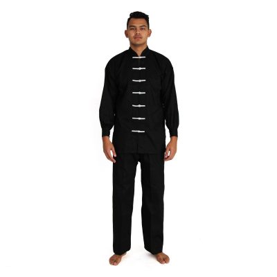 This 8oz Kung Fu uniform from SMAI is made of a poly-cotton blend for durability. It features 7 white buttons, rollback white cuffs and a snap-out collar. The pants have an elastic waistband.